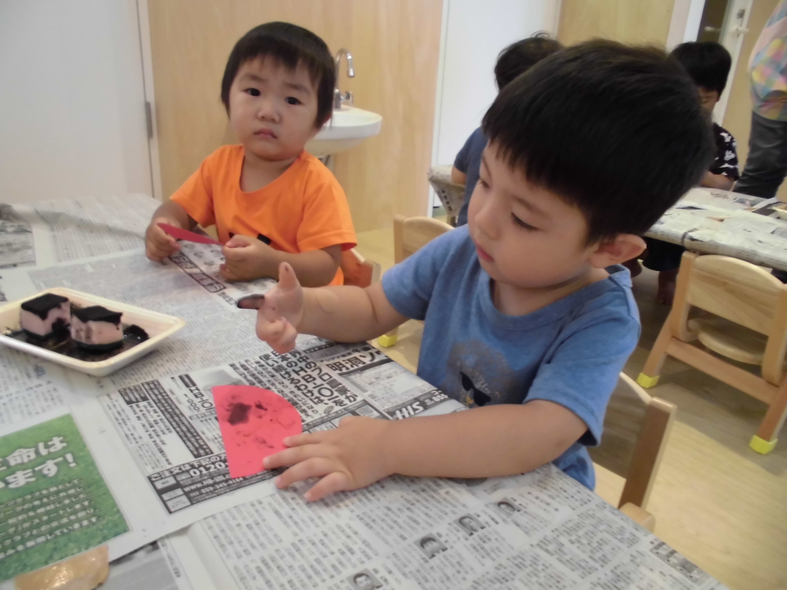 笹の葉に飾るスイカの製作では、絵具を指につけてぺたぺた♪